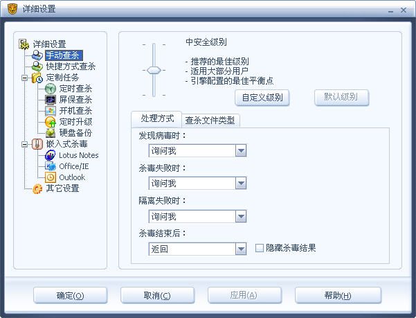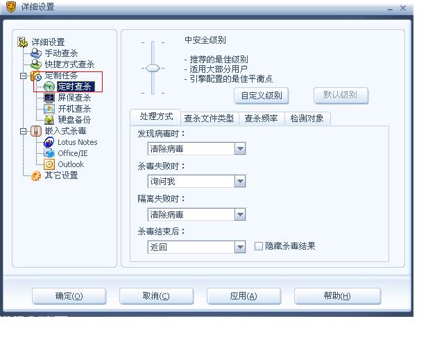 把杀毒软件---详细设置里面的手动查杀、定时查杀、快捷方式查杀都按下图设置一下