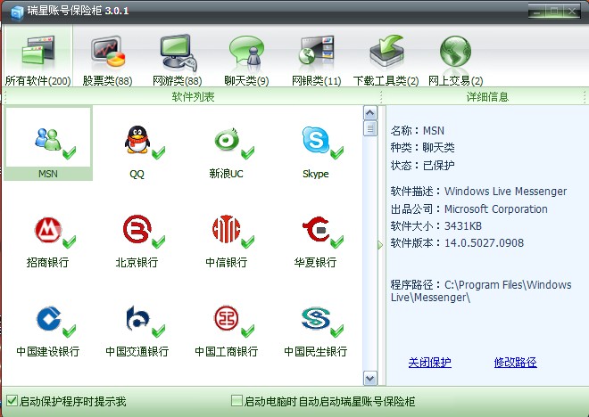 疑问:“启动电脑时自动启动瑞星账号保险柜”是不是说只有启动了保险柜才会保护各个软件的帐号?另外就是感觉将保险柜从瑞星杀毒软件中剥离出来了一样!启动保险柜时系统区内还会显示账号保险柜的图标,如下图: