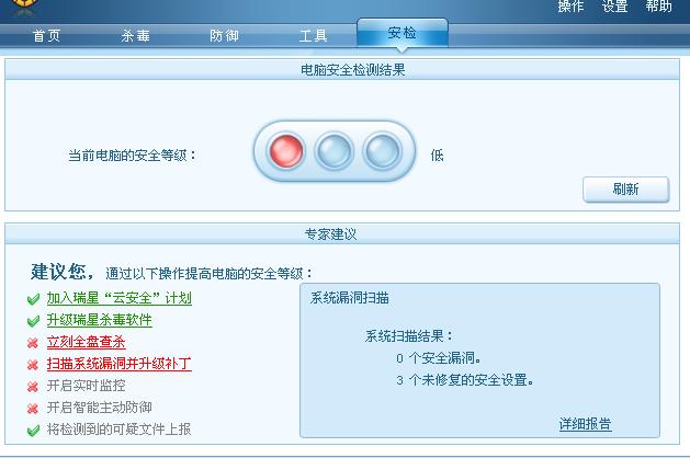 我的瑞星2008升级以后,电脑安检说我没有开启实时监控,杀毒软件上面防御哪一块是空白,卡卡说我没有安装杀毒软件和防火墙!