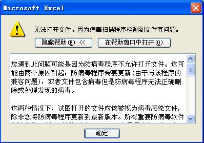 这两种情况下,试图打开的文件应该被视为病毒感染文件,除非您将防病毒程序更新到最新版本。所有重要防病毒软件制造商均已创建更新解决与 Office 应用程序兼容的已知问题,他们也通常提供病毒签名文件,此文件可从 Internet 上下载,并且必须更新以便能正确扫描所有已知病毒。