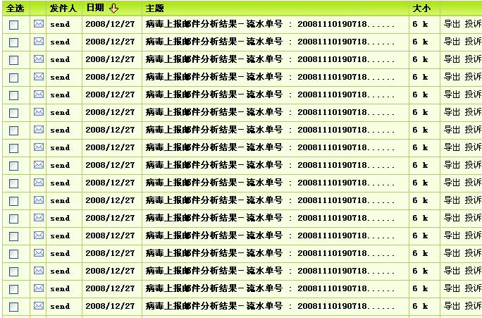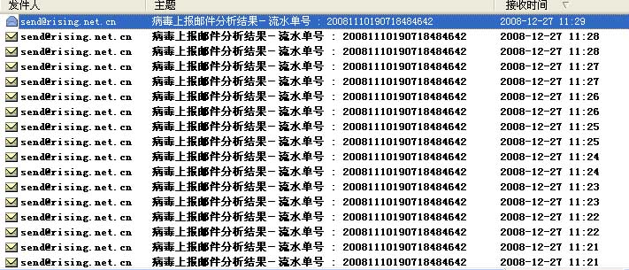 我前段时间给瑞星报过病毒,昨天突然回信了,但是同一封信一下回了1000多封。我以为是我的电子信箱出问题了,因此就删了。今天上午又打开电子信箱,居然又来了两千多封,我的电子信箱都被塞满了。希望赶快查一下你们的电子邮件服务器。害得我今天删了很长时间。累死我了。