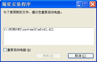 进安全模式,然后去你安装瑞星的那个盘,比如是c盘,然后按这个路径C:\Program Files\Rising\Rav\Update,找到mfc42.dll这个文件,复制一下,然后再去C:\WINDOWS\system32里(系统如果装在D盘,就复制到D盘这个目录),找到mfc42.dll这个文件,选中,粘贴,这样就将这个文件覆盖了。再重起就好了。
