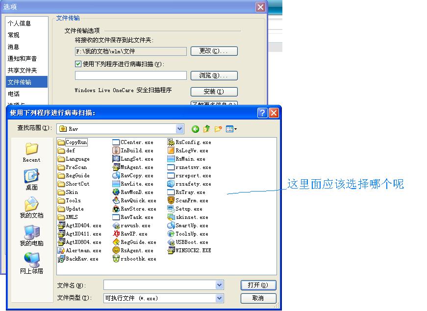 是这样的,以前使用瑞星07版时,在WLM的文件传输选项——使用下列程序进行病毒扫描时,我选择的是前面有个小狮子头的RAV.EXE,可是用了09版后,程序里就没有那个RAV.EXE,如截图所示,那我应该选择哪个呢,谢谢。