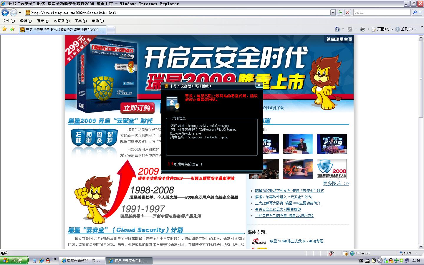 打开任何网页即报病毒,有可能是利用微软MS07-017中的动态光标处理漏洞的畸形ANI文件,一般由被挂马的网页的相关恶意代码下载。