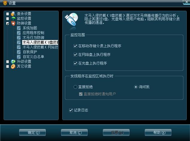打开瑞星主界面,点击“防御”----“智能主动防御”----“木马入侵拦截(U盘拦截)”----“设置”,在“监控范围”的“在光盘上执行程序”,前面的勾取消。