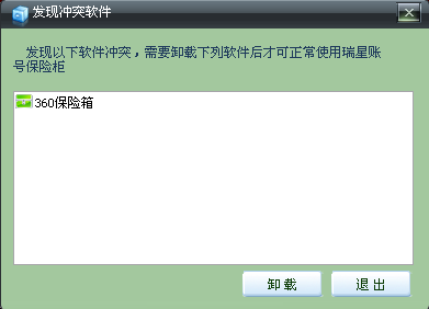 装上之后未重启,升到最新版本了,一直到晚上关机睡觉,今天早上开机时出现"瑞星帐号保险柜"与"360保险箱"冲突...要求卸载