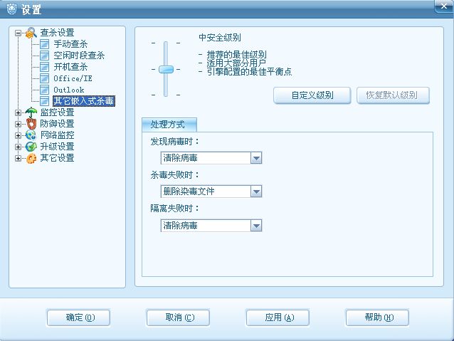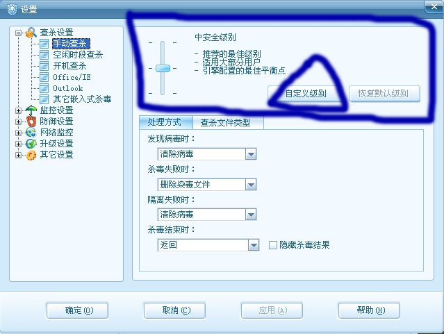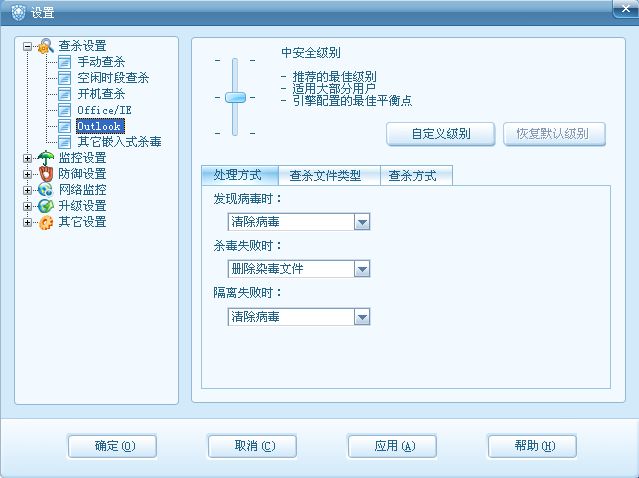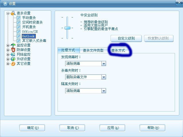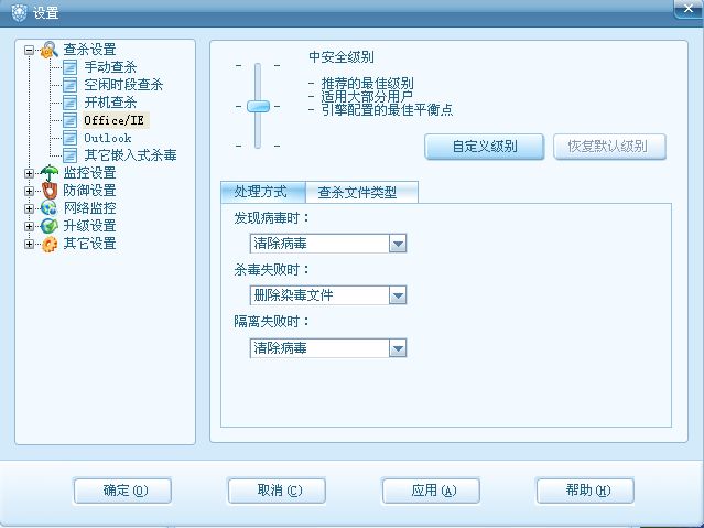 首先还是安全级别可以自定义,常规设置中病毒处理方式不说了我们看: