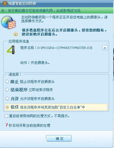 每次电视卡启动主动防御就会拦截,提示放行不,白名单里也有他,为啥不管用呢。想自动开机录电视的,这样根本开不起来啊。 瑞星赶紧解决这个问题吧,实在是个闹心的问题。