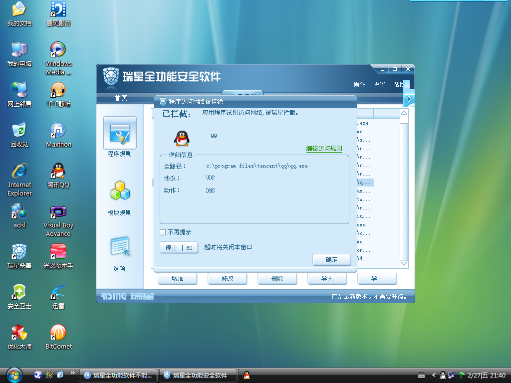 瑞星全功能软件不能阻止QQ程序运行,我在访问控制中设QQ为拒绝,但还是可以启动运行.见截图