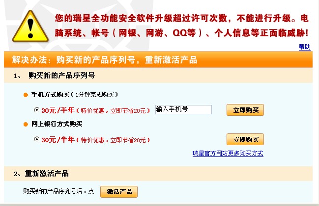 (瑞星单机版产品授权在一台计算机的一个操作系统中安装使用)如果超出授权,那么会出现升级超次的情况。如果确实需要多台计算机使用瑞星软件,可以根据实际需要去购买瑞星企业版软件或购买多套单机版软件。