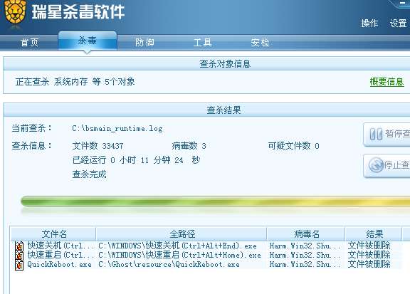 我一直在用瑞星杀毒软件。但是目前出现的问题很让我头痛。 我在用杀毒软件杀毒时,发现病毒(是快速关机、 和快速重启)而且它们的备份也给算病毒。我还原系统也不行。只要我升级杀毒软件,这3项就算病毒。请专家帮忙解决。