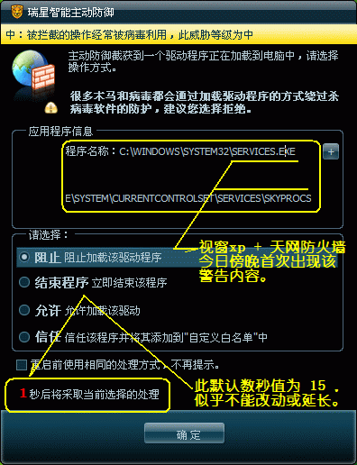 如果选择 “信任” 可让上述主动防御警告不再出现,问题是此时 “信任” 的是视窗组件 “Services.exe” 而不是天网防火墙应用程序,这将导致以后安装其它未获确认的应用程序其驱动组件时都会被放行,显然这是一较危险的安全隐患。