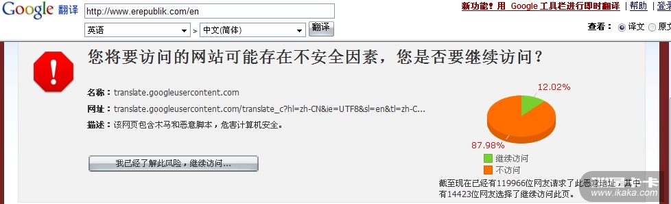 因为有些用Google翻译翻译到一些有被挂马的网站,于是有人报告了,然后所有采用Google翻译的网址就被列入黑名单了。。。。瑞星应该针对某张网页,而不是直接针对某个网址。。。。