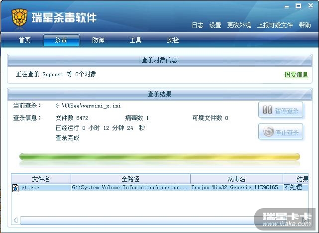 病毒在系统还原目录里,瑞星没有权限删除文件,关闭系统还原功能,病毒会自动被清除掉的。