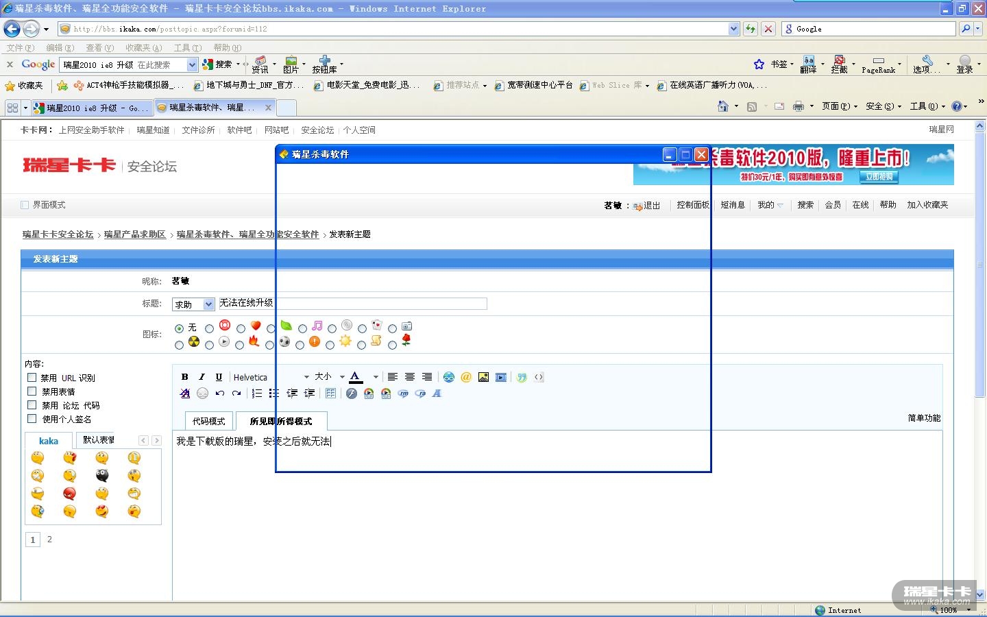 我是下载版的瑞星,安装之后就无法自动升级和激活,弹出一个对话框以后就没反应了,我的系统是XP,IE8浏览器,瑞星是刚卸载09版再装上去的,请问有什么问题?