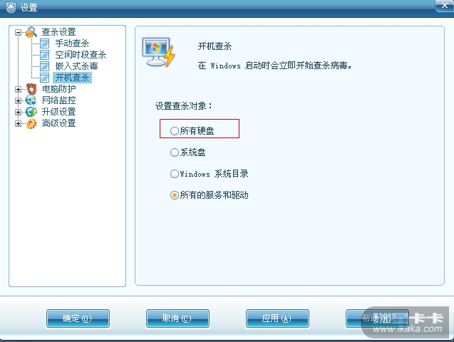开机查杀默认是对所有的服务和驱动进行查杀。可以参考下图来设置全盘查杀。