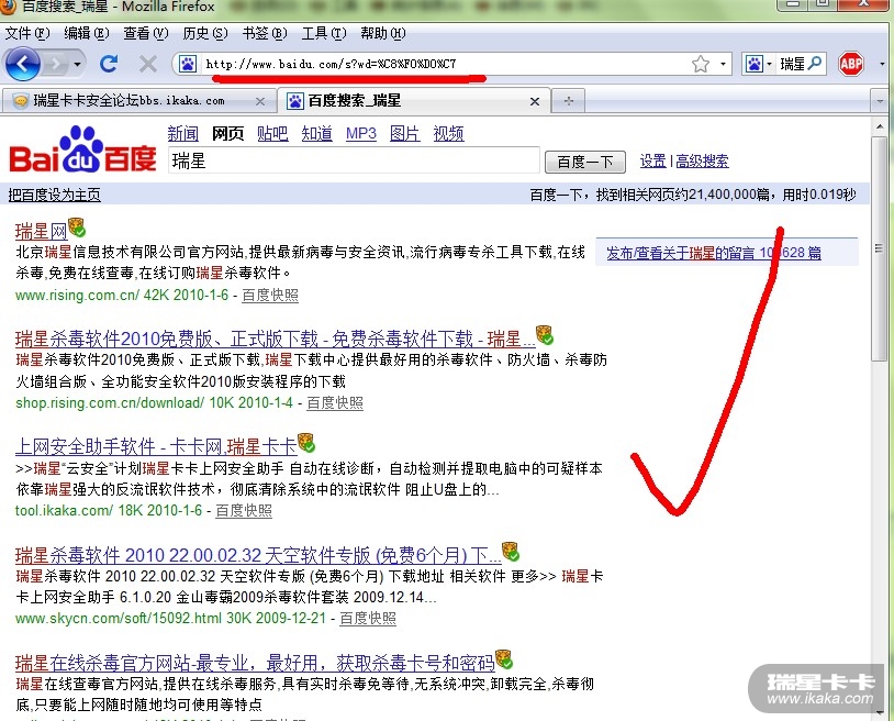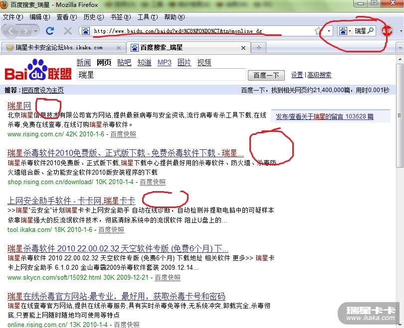 使用官方原版火狐的时候用搜索框百度搜索的条目中,第一页没有瑞星的检测标志,只有点击第二页才能有检测标志