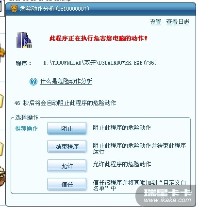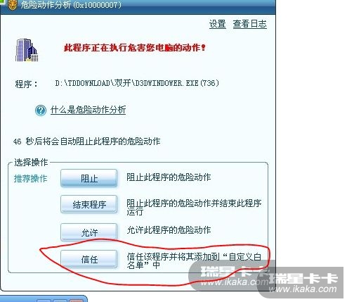 这个如果你确定是安全的程序就弹出框的时候,点击信任。或者加入木马行为防御白名单