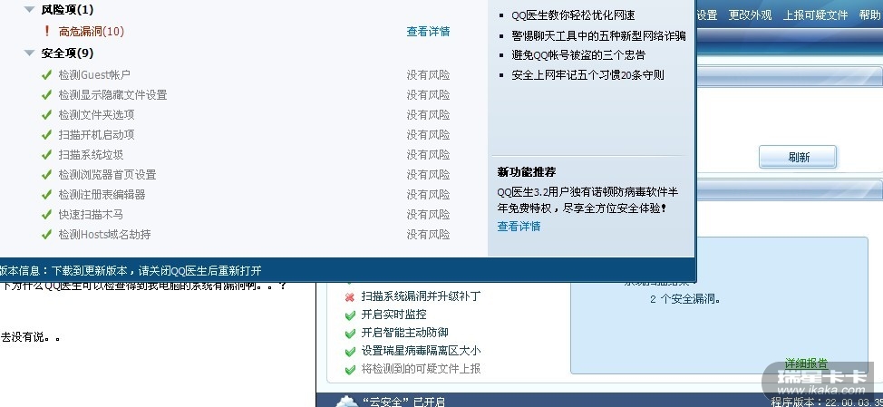 我认为卡卡的系统漏洞库不齐全,QQ医生可能用金山的漏洞库