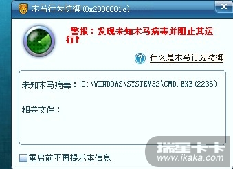 楼主,补充一下,最好用卡卡修复一下系统,虽然应该只是触及瑞星的行为防御规则,没什么大问题,但是还是修复一下更好