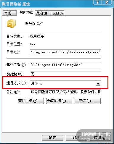 此外还有解决一个办法。首先您打开账号保险柜的主界面,在下方取消勾选“启动电脑是自动启动瑞星账号保险柜”,让它不能随机启动。然后到您的瑞星安装路径下,查找rssafety.exe这个可执行文件,它就是账号保险柜,在桌面新建一个快捷方式,指向这个rssafety.exe,创建成功后右键点击属性,在“运行方式”中选择“最小化”。最后把这个快捷方式拖入启动文件夹下(即开始-程序-启动)。这样一来它既可以随机启动又可以开机最小化。这个办法在我的电脑上奏效,建议您尝试一下