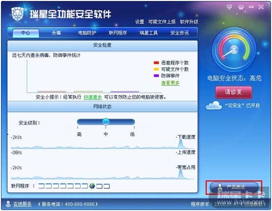 II、打开瑞星全功能安全软件主程序界面,单击【产品激活】按钮,启动注册向导。