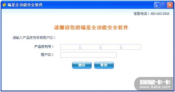 I、输入产品序列号和用户ID:请在下列激活窗口中输入您的瑞星全功能安全软件产品序列号和用户ID