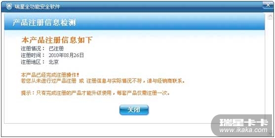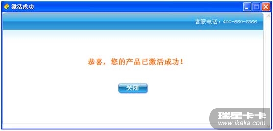 II、如果您在激活窗口中输入的是已注册的瑞星产品序列号和用户ID,单击【激活】按钮,如果弹出以下窗口,则说明瑞星软件成功激活!此时,您无需对产品授权进行再次注册,即可享受软件升级服务。