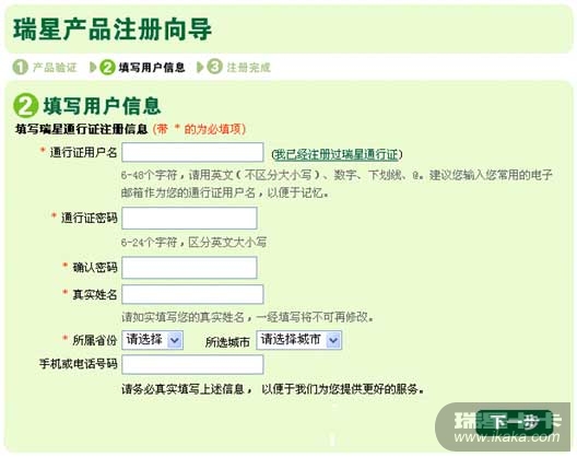 在激活成功窗口中,单击【立即注册瑞星产品】,将弹出“②填写用户信息”页面;在该页面中,需要您在留有空白的地方填写相关的注册信息,填写完毕后,单击【下一步】继续