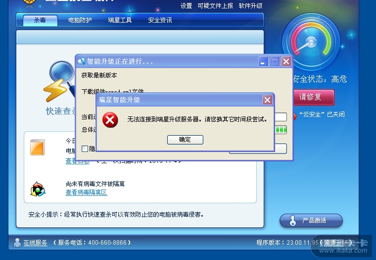 无法连接到瑞星升级服务器。请您换其它时间段尝试。
