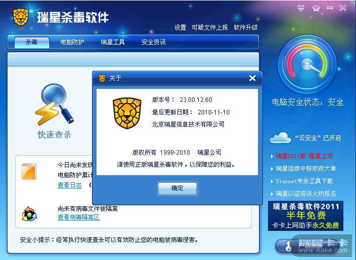 回复:新版的瑞星杀毒界面没有版本号2011,关于对话框里也没有。