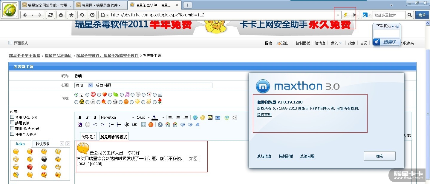 贵公司的工作人员,晚上好!在使用瑞星论坛发帖子的时候,遇到了一些问题。(如图)