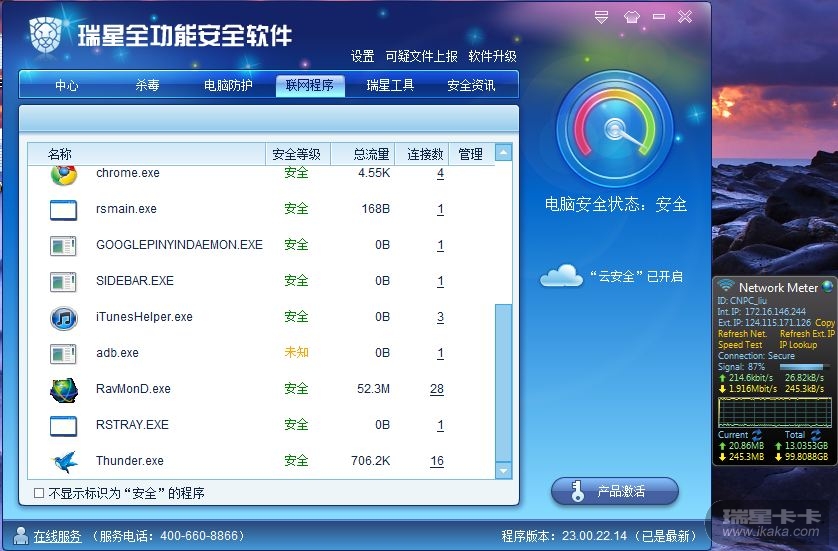 求来个工程师开看看,吗回事!显示是一会一会的在显示的时候发现ravmond.exe一直在不停的产生流量,2,3分钟就能产生20多MB的流量!我也不清楚这20多是上传还是下载!