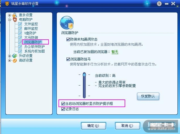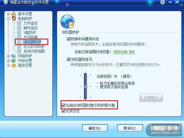 瑞星有浏览器防护的功能,所以打开浏览器的时候会弹出那个提示,你可以按照上边几位童鞋的方法去掉提示框,也可以选择不保护浏览器,方法是瑞星杀毒软件--设置--电脑防护--浏览器设置--当前已被加固的浏览器--将ie前边的勾选去掉即可。