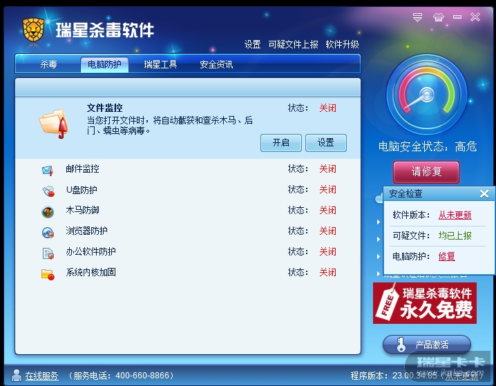 另外,已经重新下载2011免费版,安装后提示电脑高危,发现所有监控已经关闭,而且无法开启和设置。防火墙09版安装后自动关闭网络防护。。。