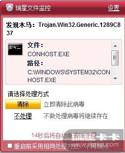 不知道为什么瑞星对conhost.exe文件报毒而且还不能清除!