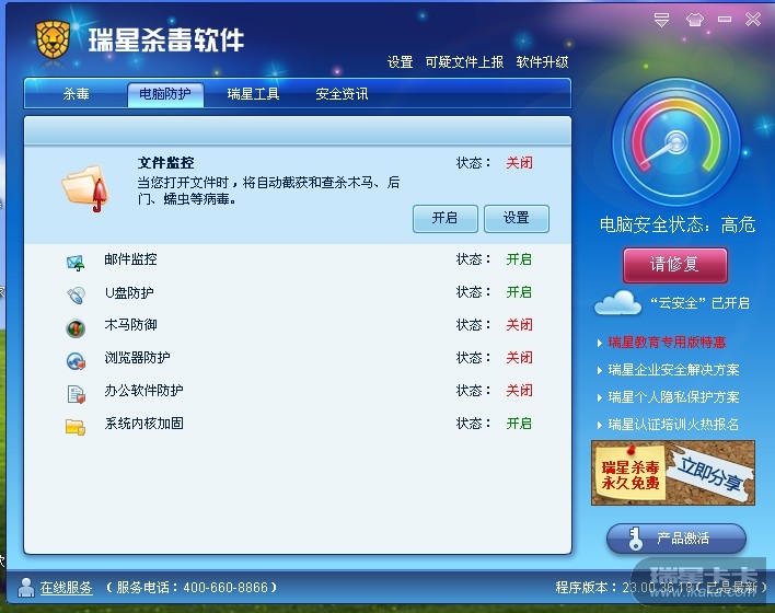 继续安装便会不能开启电脑防护,无法杀毒。我重装了一遍瑞星但还是没有用,修复也没有用。