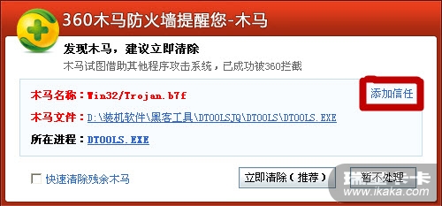 如果是木马防御提示的,您直接点击【信任】,即自动加入到木马行为防御白名单中了