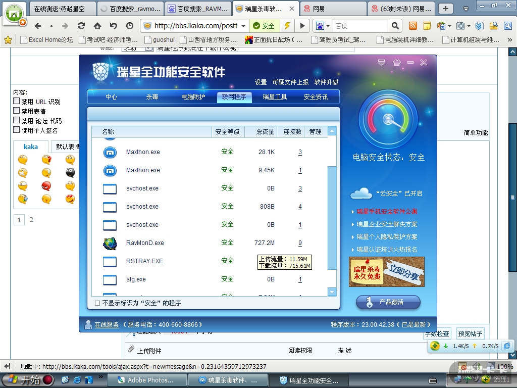 最近发现联网程序里面的瑞星程序一直在下载东西,看瑞星下面提示已经是最新版本,不要告诉我还在升级,最近网速很慢,8M的宽带看个在线的电视剧都卡得一顿一顿的,怀疑是因为瑞星下载的问题,附带上传一张截图,请给看一下,期待尽快得到答复!