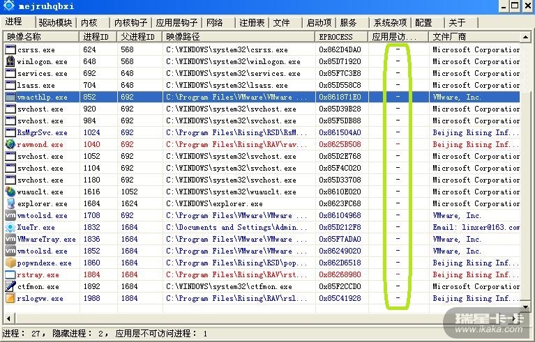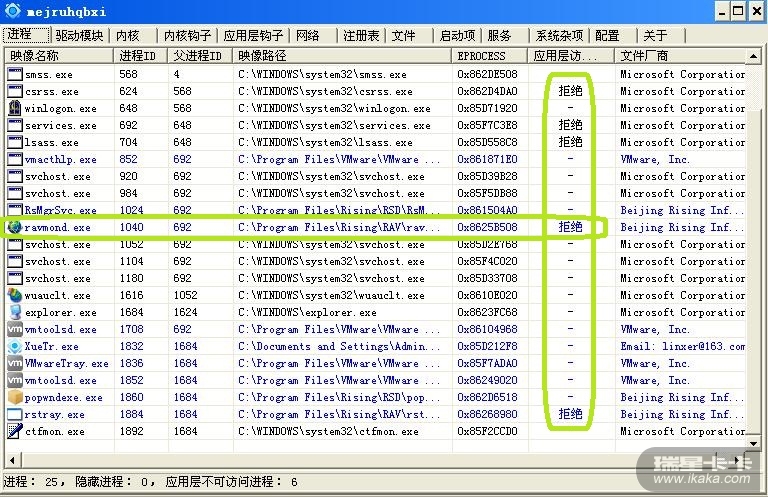 结果:瑞星的进程在ring3下拒绝访问,但被结束进城后ring3 下能访问瑞星的进程