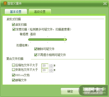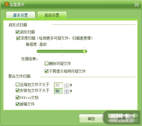 上午搞了几个病毒样本用自定义扫描扫了下,开了高启发。瑞星怀疑了几个文件,自定义扫描设定如下: