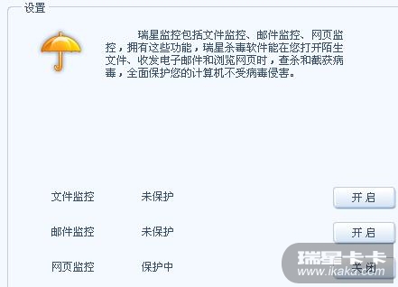 请教:我的瑞星2008是光盘牌的正牌软件,现在重装后,小雨伞是黄色的,不能启动“文件监控”、“邮件监控”功能,我点了开启的,还是不能启动。是什么原因呀?谢谢。