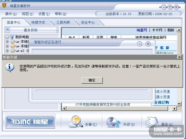 我的瑞星杀毒软件最近一直提示 :您使用的产品超过许可的升级次数,无法升级!请等待新版本升级。注意:一套产品仅授权在一台计算机上使用。