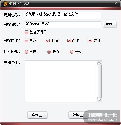 本以为这样就可以防范了,殊不知下次瑞星升级更新时为了更新文件暂时退出了监控,大家都知道,只要瑞星的文件监控一破坏或者退出,其主动防御就会完全失效的,那么我上面的这个防御规则就变成无用了,唉!真是痛苦啊! 我今次发这个帖子只是希望瑞星不要这样做好不好?对于瑞星我心中还是支持的,可是这样做是真的不行的,考虑一下吧!