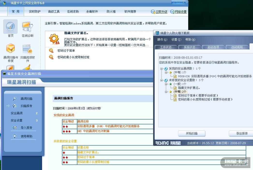 如图,卡卡、杀毒、防火墙一起扫描系统漏洞,出来三种结果~!