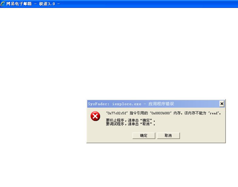 出现问题前的操作步骤:第一幅图所示为打开邮箱时出现,偶而这样。点确定后网页关闭。第二幅图为点开网页浏时出现,点确定后消失。可继续浏览。