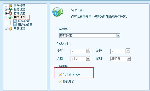 谢谢啊,以前是用金山的,升级时间比较固定.这个还不清楚.另外:那个:只升级病毒库要选择打对号吗?