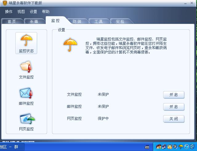 我使用的是免费赠送一年的瑞星组合套装,我天天升级,可是今天一开机绿伞就变成了橙色,提示“以下监控已禁用:恶意行为检测 文件监控 邮件监控”,我想重新开启他们,也没有反应。这是怎么回事啊,是不是中毒勒,可我杀毒没有啊。。。。帮帮我,怎样解决。谢谢