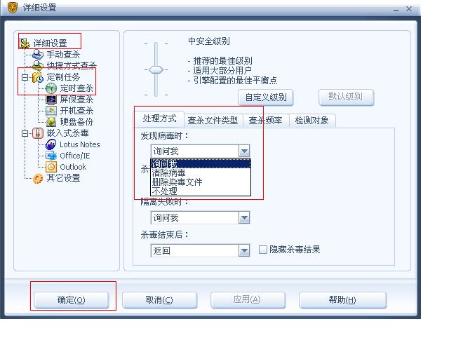 你可以把详细设置这里面关于“发现病毒”时的处理方式全部统一改为你需要的处理结果即可。