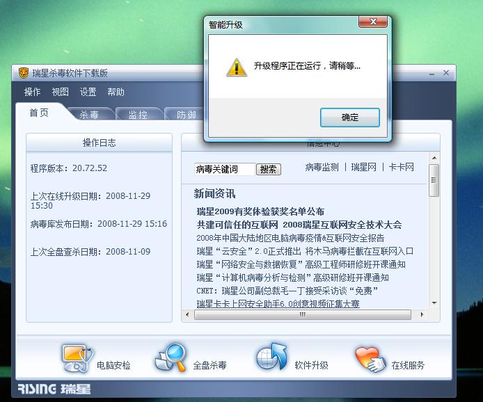 我后来发现我的瑞星有了变化: 单击软件升级时,老是提示"升级程序正在运行,请稍等..."字样,我以前没有遇见过这种情况!!!